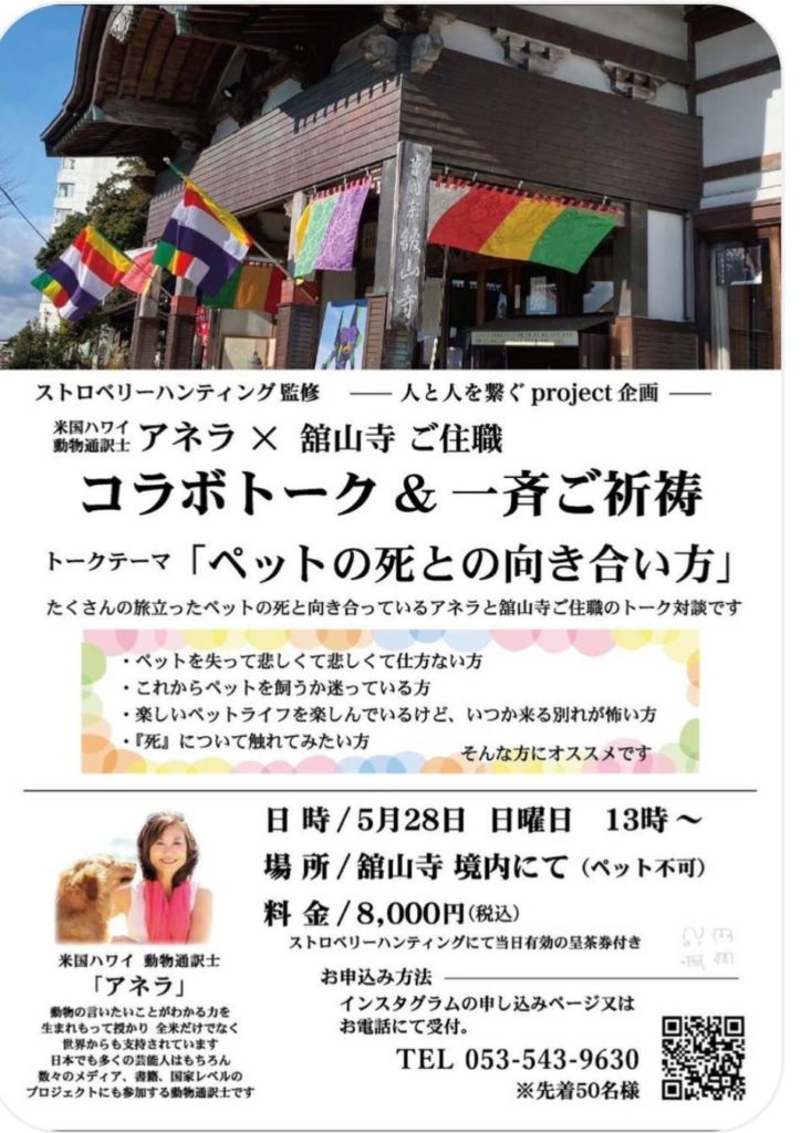 米国ハワイ動物通訳士のアネラさんが舘山寺でご住職と「ペットのとの向き合い方」をテーマに対談を行います。