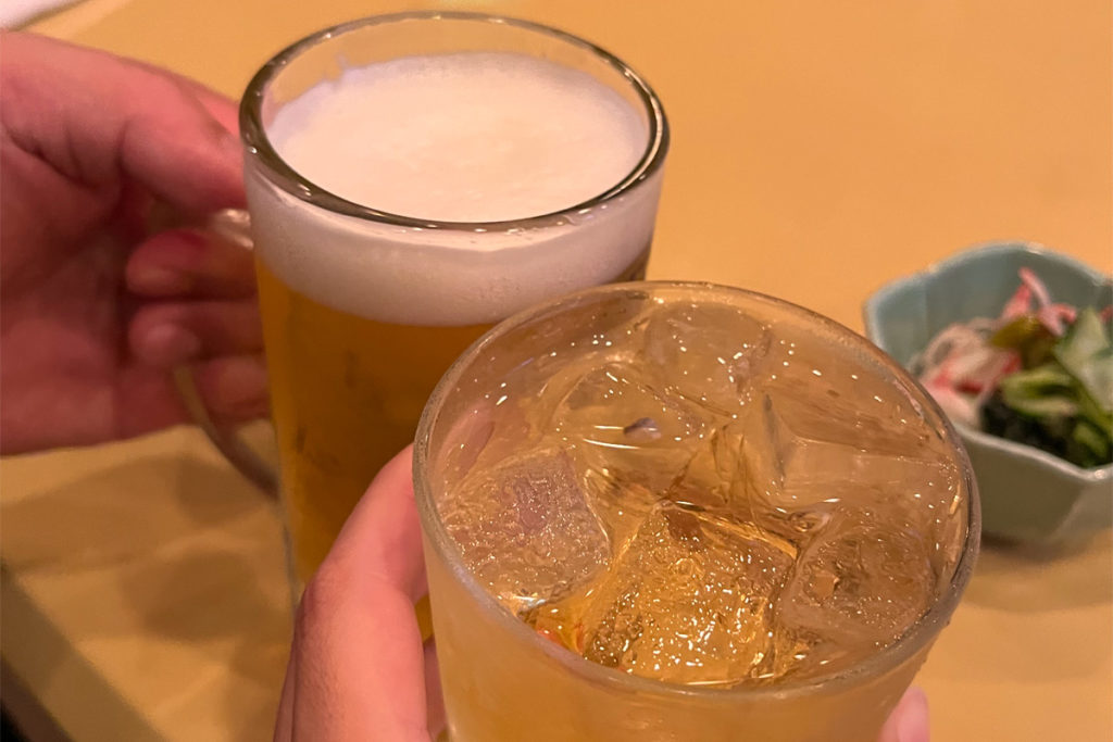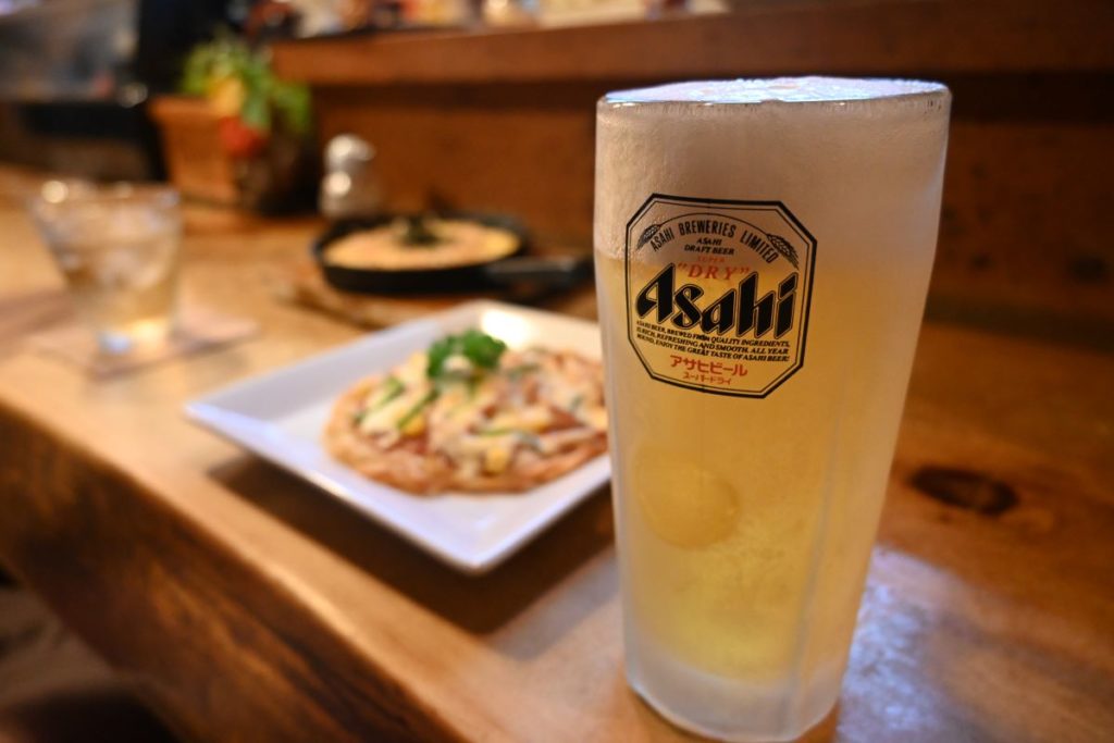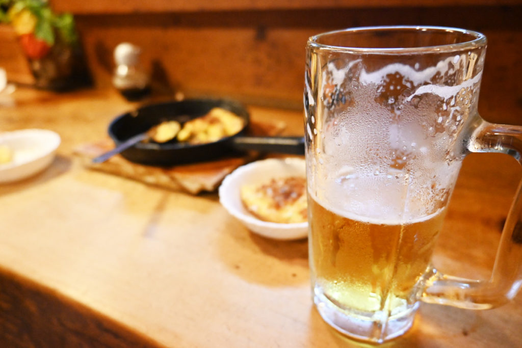 暑い外からお店に入ると涼しい〜。夏のこの感じ大好きです。店内は木目がとっても良い雰囲気のカウンターとボックス席、大人数でゆっくりできそうなお座敷があります。どこか懐かしいような、ゆったりと落ち着ける空間です。早速、私はビール、かなは梅酒ロックを注文します。三ヶ日みかんハイボールも美味しそうですが、やはり一杯目はビールにします!食べ物は、おすすめメニューの「長いもステーキ」と「ポテトピザ」を注文しました。