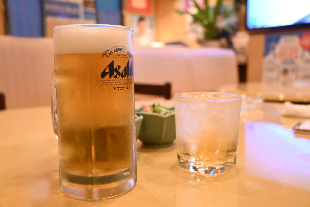 一太郎さんは門前通りを出て左に曲がってすぐのところ、大村酒店さんの向かいにあります。中に入ると昭和レトロの雰囲気で写真映えしそうな店内です。何枚も貼られた演歌歌手のポスターとネオンがいい感じ。「よく来たね~!!座って座って~!」と素敵なママがお出迎えしてくれました。席はゆったりとくつろげます。早速ビールと梅酒ロックをお願いします!料理はおすすめの1品をお願いします。