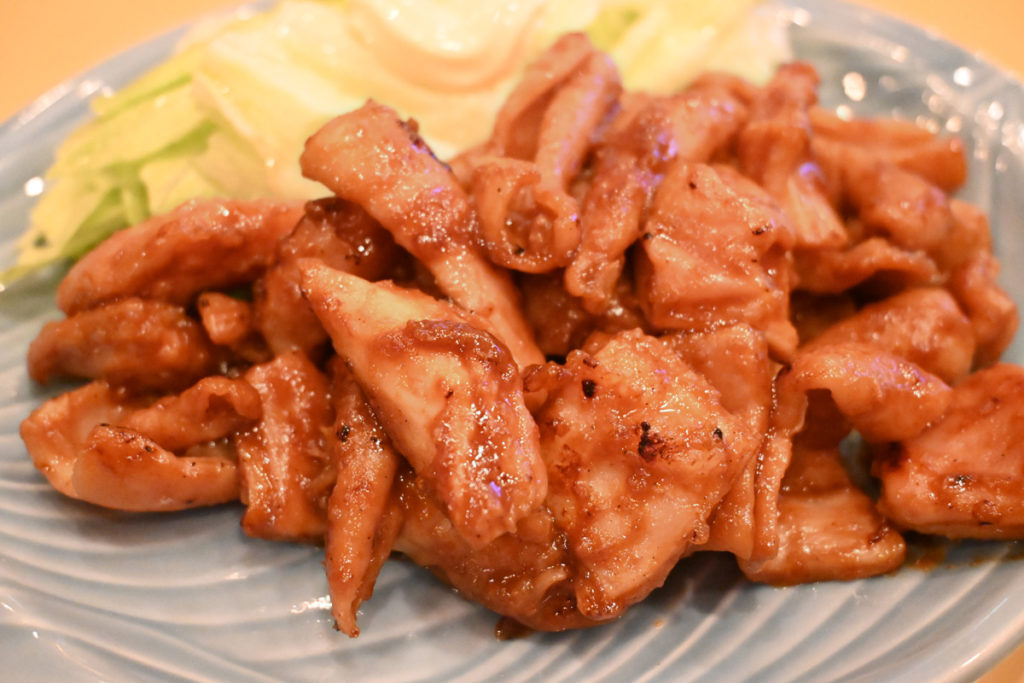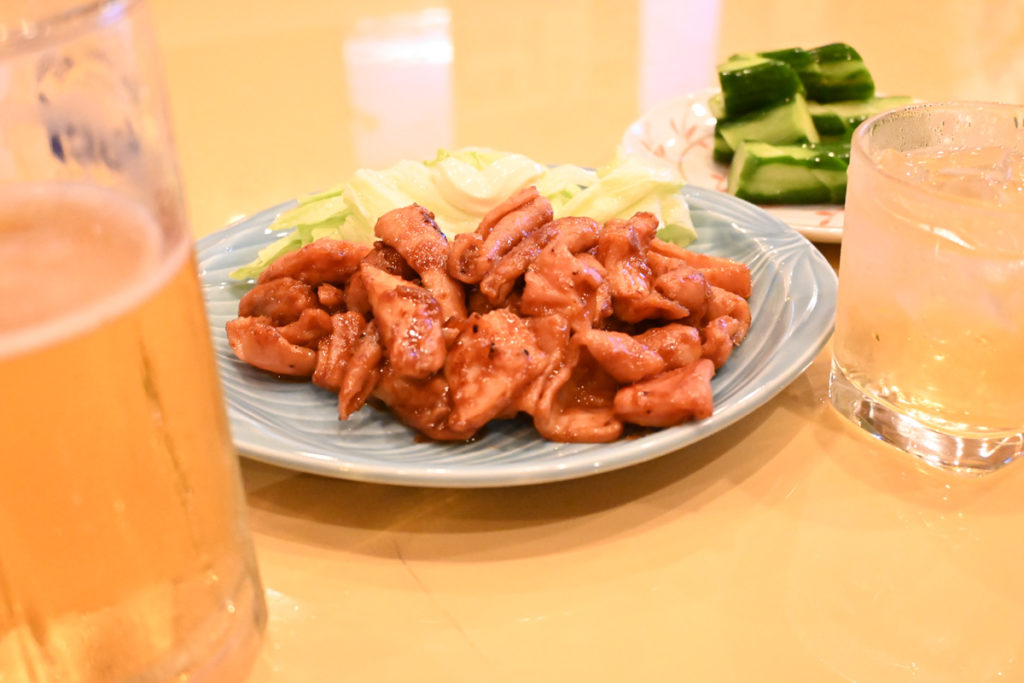 飲み物が来ました~!お通しの酢の物と一緒に「漬けてみたからどうぞ~」とママお手製のきゅうりの浅漬けを出してくれました。嬉しいー!夏にビールと酢の物ときゅうりの漬物は最高の組み合わせですね。おすすめの一品も来ました。やった!ホルモン焼きです。このホルモンはママが浜松で一番おいしいホルモン屋さんから仕入れているんだそうです。臭みがないホルモンと味噌だれがマッチしていて美味しいです。これだけ美味い肴があるとお酒一杯じゃ足りない…。ホルモンは仕入れ状況によって用意していないときもあるので、料理は事前に電話しておくのがおすすめです。