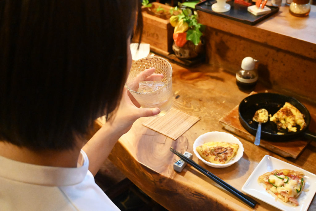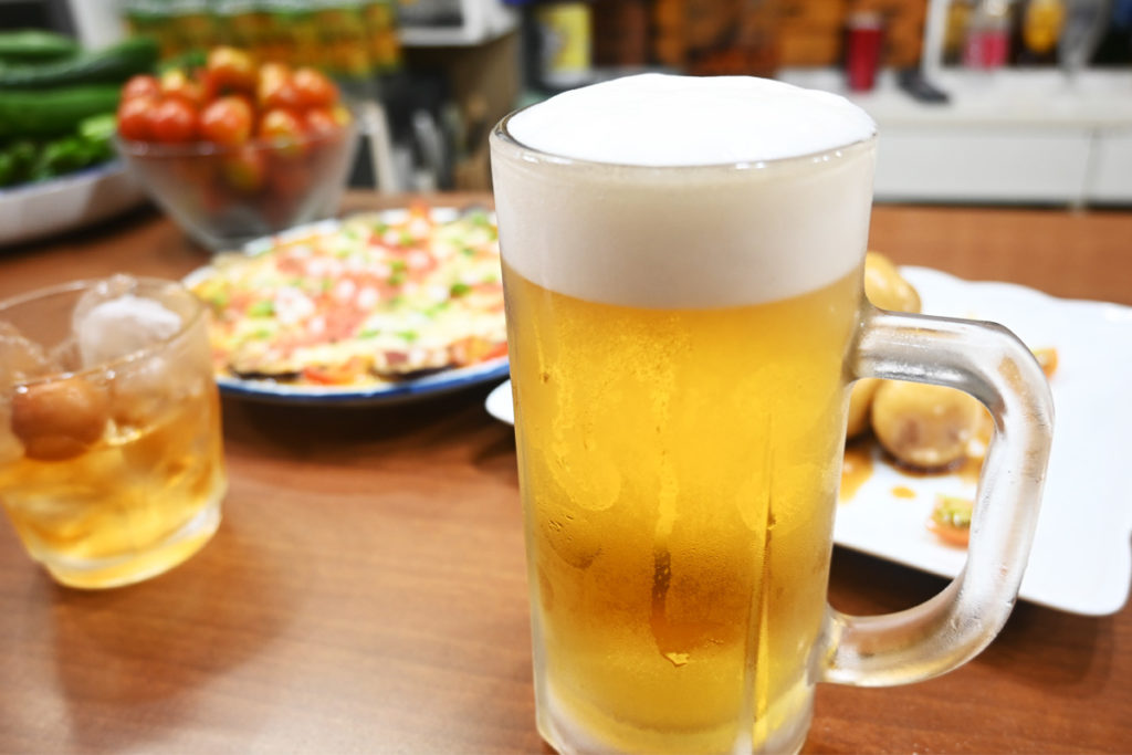 地元の野菜を使った料理楽しみです!それでは2軒目もビールと梅酒のロックをお願いします!食べ物は、大将におまかせでお願いします!