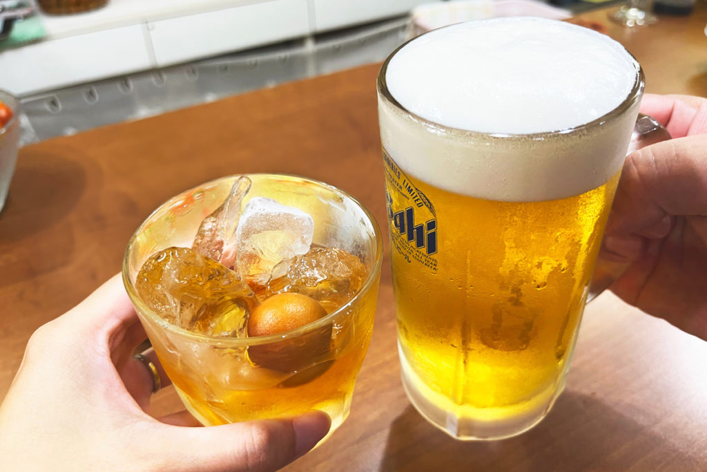 飲み物が来ましたー!かんぱーい!2杯目のビールも美味しい~。自家製の梅酒も甘くて美味しいです!