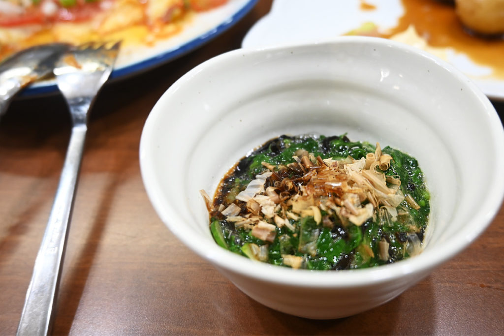そんなことを話していると、メニューになかったはずのモロヘイヤと塩昆布ときゅうりの和え物を出していただきました。これがまた美味しいんですよね!ネバネバの中に時折感じるきゅうりの歯ごたえがいい感じです。