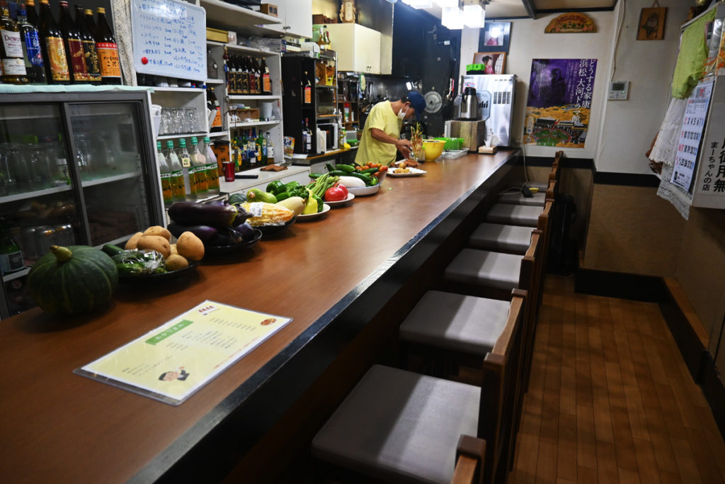 記事用に写真をパシャパシャ撮っていると「取材ですか?」と気さくに声をかけてくださいました。声をかけてくださった方を見ると大柄でヒゲの生えた男性が。ヒゲさんは、仕事現場が長期で浜松になった時は、決して現場が近いわけではないが、舘山寺のアパートを借りるんだそう。理由を聞いてみると、舘山寺の街が好きだから!そんなヒゲさんに、にぐるまさんの魅力を聞いてみると、にぐるまさんには野菜を食べたくなったら来る。野菜を扱わせたら一番だと仰っていました。また、夜の舘山寺の魅力を聞いてみると、常連さんのキャラクターが濃くて一緒に飲むのが楽しいんだそうです!