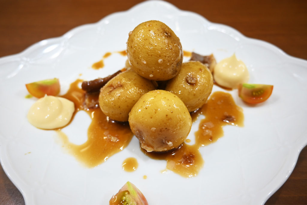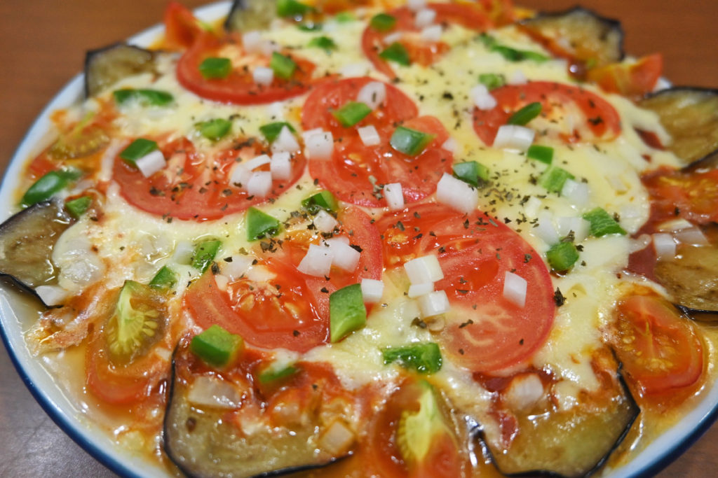 美味しそうな料理が来ました!一品目は浜松の特産品三方原のジャガイモを使った煮っころがし。甘辛く煮た照り照りのジャガイモはホックホクです。次に近所で採れた茄子とトマトのチーズ焼き。火の通った野菜の甘味とチーズが相性ピッタリ!ブラックペッパーと玉ねぎ、ピーマンが味を引き締めてくれます。ビールが進む~!