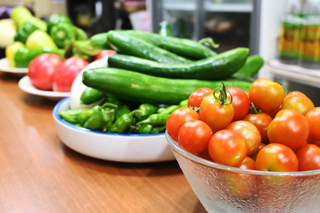 次は、にぐるまさんへ向かいます。おしどりさんから門前通りに戻って、松の家さんの角を曲がったところに、にぐるまさんはあります。表には、お花や苔のテラリウムが沢山飾ってあります。あとで大将に聞くとお花屋さんに間違えられることもあるとか。店内に入るとカウンターとボックス席が1つ。先ほどお邪魔したおしどりさんとはまた違った雰囲気の良さです。入ってすぐに目に入ってきたのは色とりどりの野菜たち。美味しそうな夏野菜がずらっと並んでいます。美味しそう~!にぐるまさんで使用する野菜の多くは、近所の農家さんからいただいたものなんだそうです。