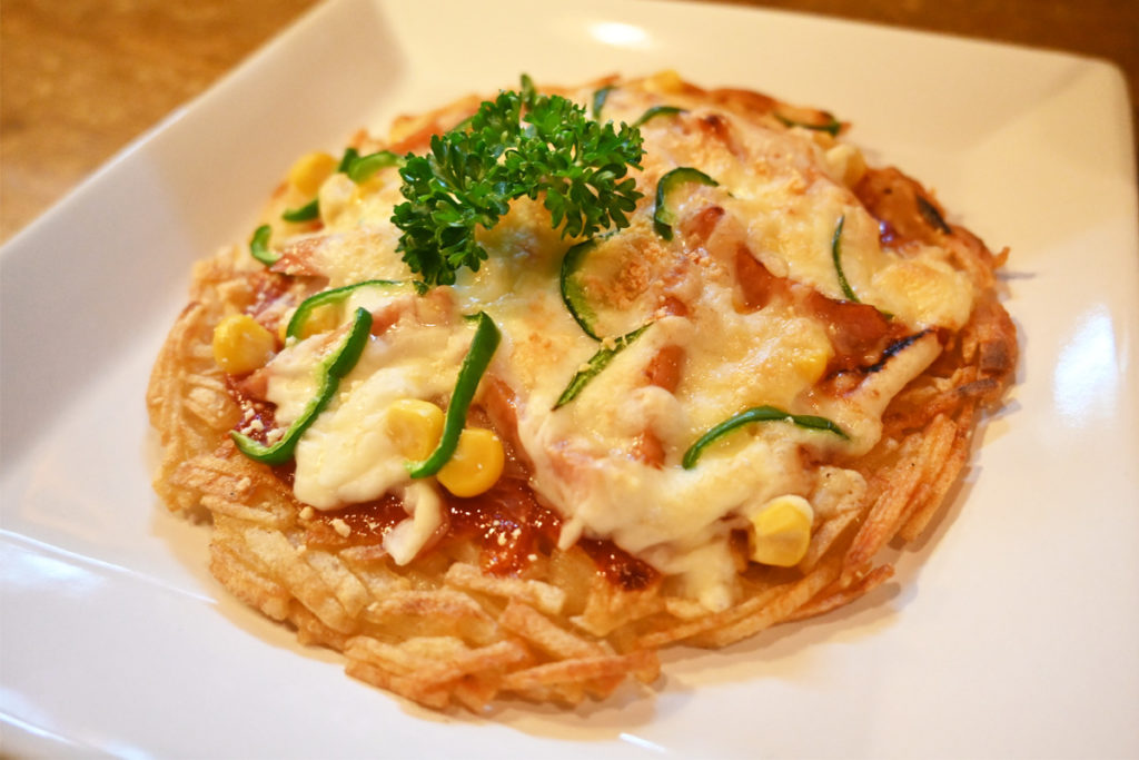 ポテトピザは千切りのジャガイモの上にピザの具をトッピングして焼き上げています。スライスではなく千切りなんですね。いただきます。おお~、千切りになっているのでジャガイモがパリパリとしていて美味しい!これはお酒に合いますね。どちらのメニューも人気が出るはずです。