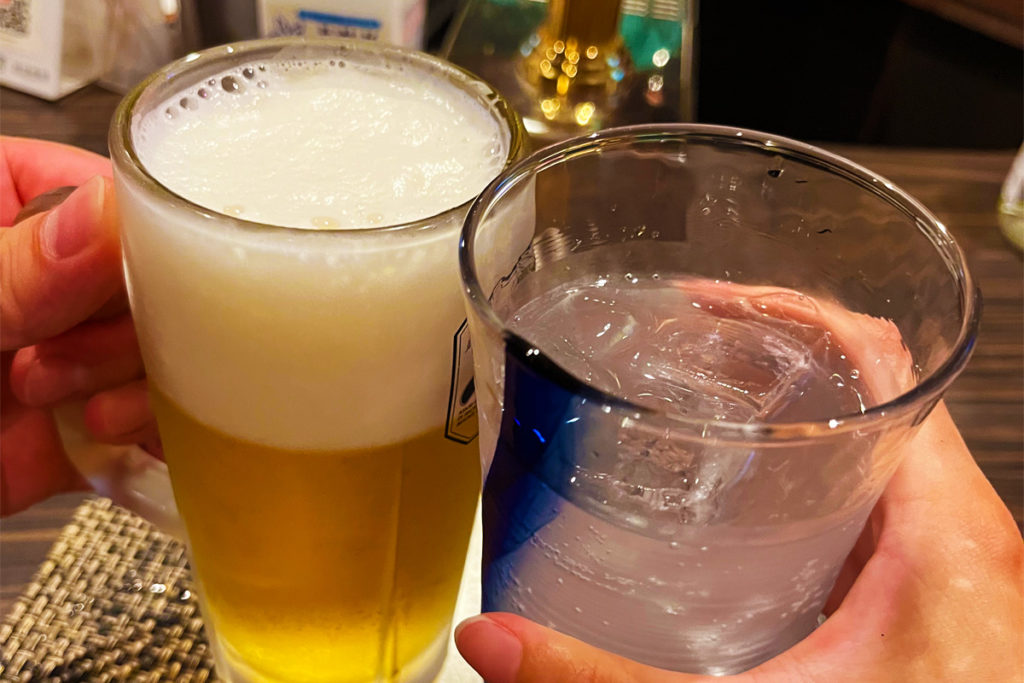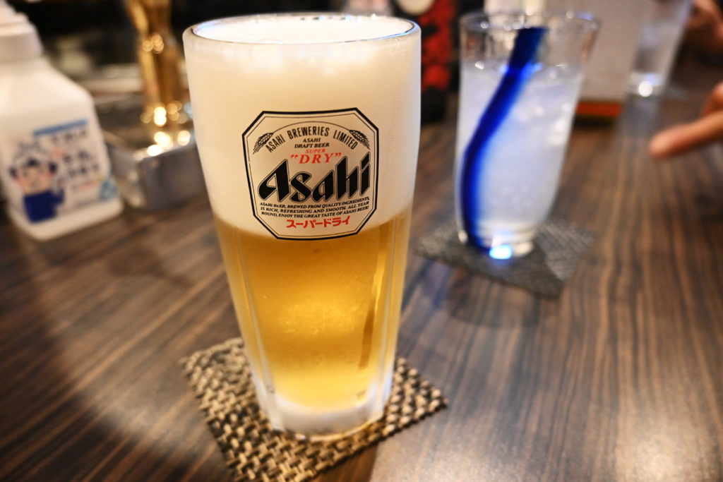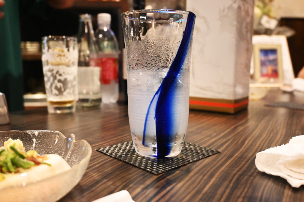 ママこだわりのビールは、常に新しいビール樽から清潔なジョッキに見事なバランスで注いでくれます。本日4杯目のビールも最高に美味しいです!かなは甘いレモンハイを出していただきました。清涼感のあるブルーのグラスがおしゃれです。