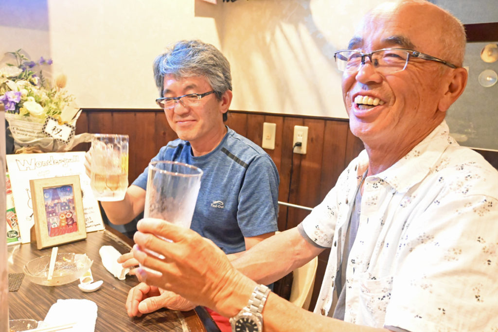 お酒を飲みながらお隣の方ともお話させていただきました。きみちゃさんとりょうくんは館山寺町のお隣の呉松町の方で、今日は浜寿しさんで寿司を食べてからWonderful Tonightさんに来たそうです。いいコースですね~。長年、かんざんじで飲んでいるお二人にWonderful Tonightさんの魅力を聞いてみると、ママがどんなお客さんに対しても平等に、丁寧に接客してくれるところだと仰っていました。常連の方も、初めて来た旅行の方も同じように丁寧に接客してくださるのは嬉しいですね。あとは、常連さんにいい人が多いのもこの店の魅力だそうです!かんざんじの事や、お祭りなど楽しく話しているとあっという間です。お二人はこの後、一太郎さんへ行くそうです。楽しいお話をありがとうございました!